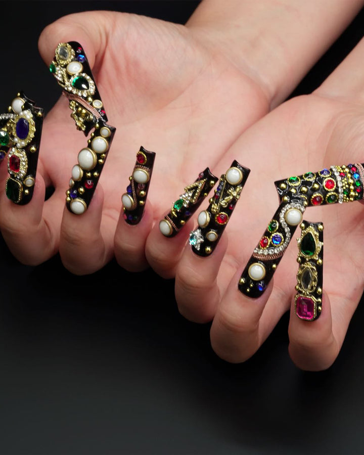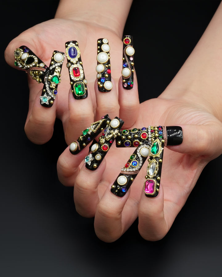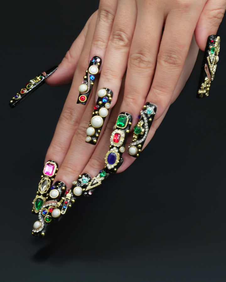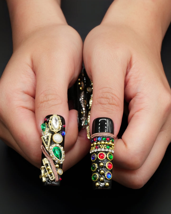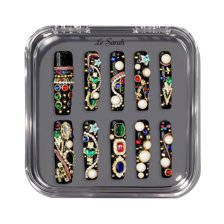 Le Sarah's Stellar Mirage, a dazzling piece from our SCI-FI Collection, draws inspiration from intergalactic treasure troves. This design features a sleek black base, adorned with vibrant, multi-colored gemstones, intricate metallic filigree, and luminous pearl accents that mimic the sparkle of distant stellar phenomena. Capturing the allure of cosmic opulence, these nails bring a bold, luxurious charm to your style, perfect for anyone looking to embrace a futuristic, jewel-encrusted aesthetic.