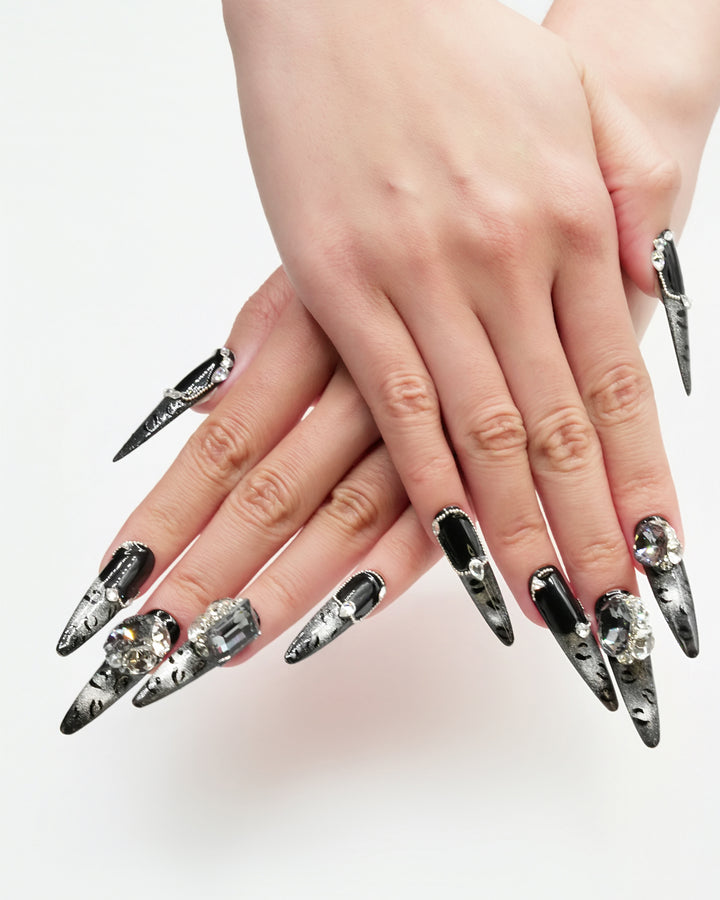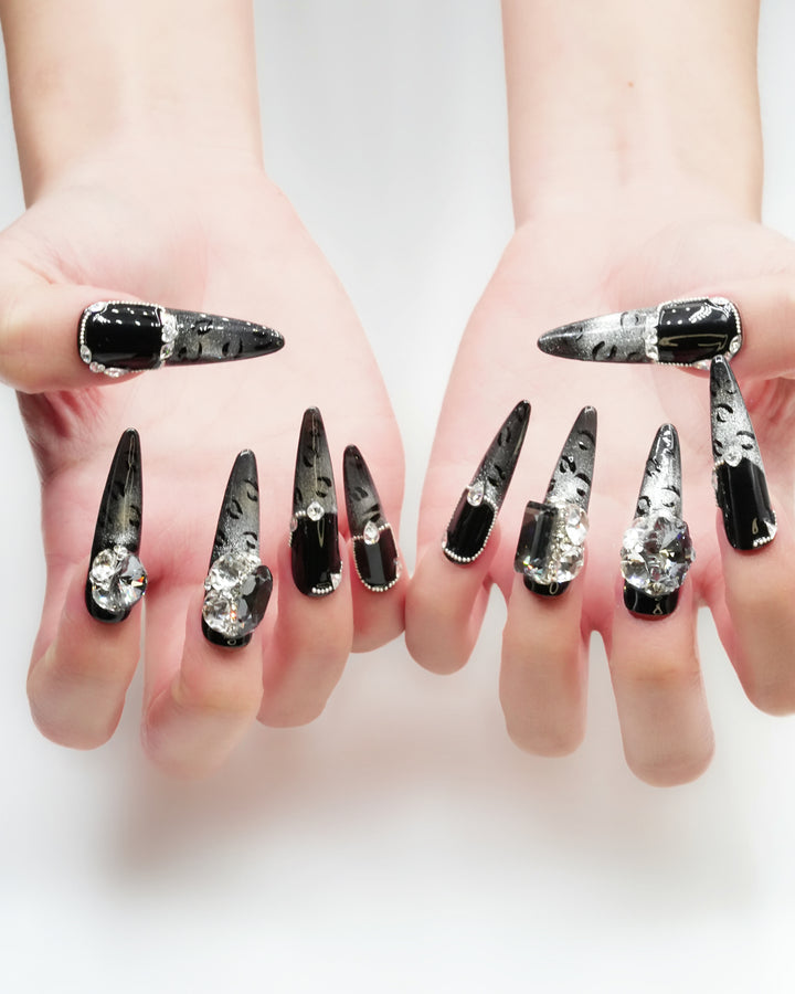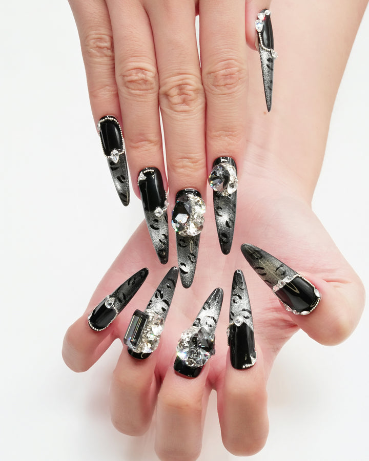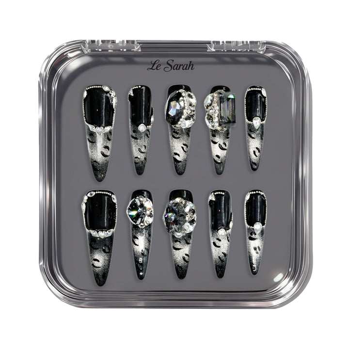 Le Sarah's Wild Kitten from the Fine Jewelry collection is a bold fusion of edgy charm and luxurious detail. This design showcases sleek black tones, adorned with dazzling crystal accents and eye-catching gem-like embellishments. Evoking the spirited allure of a playful wild kitten, these nails bring an air of daring sophistication and captivating glamour to your look, perfect for making a fearless fashion statement.